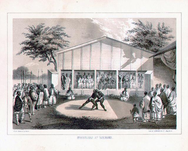 Keywords: Sumo at Yokuhama 1840.jpg Wrestlers at Yokuhama Lithograph Heine printed by Sarony New York 1840s PD-Art Sumo in art Lithographs Artworks missing infobox template