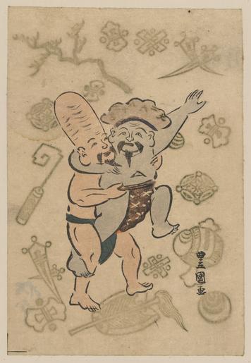 | Keywords: Sumo match between Daikoku and Fukurokuju..tif Artwork Creator Utagawa Toyokuni II Print shows the Buddhist gods Daikoku and Fukurokuju two of the seven lucky gods of Japan as sumo wrestlers 1831 Woodcut colour Size cm 12 8 18 9 Institution Library of Congress object history exhibition history credit line jpd 00271 accession number PD-old-auto-1923 1835 Utagawa Toyokuni II Parodies of sumo Daikokuten Fukurokuju | ||||