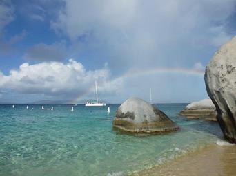 Keywords: sun beach caribbean sailing boat rainbow rock sea water sand sail sky clouds