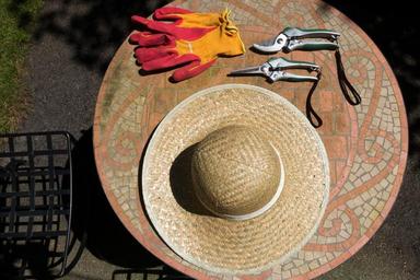 Keywords: sun hat protection uv radiation scissors pruning shears gardening equipment glove orange red faceplate gardener work glove gardening work garden flat design table about mosaic