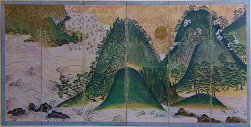 | Keywords: Sun and Moon Landscape Kongoji1.jpg en Jitsugetsu sansui-zu Landscape with the Sun and Moon Right Pair of Six Folded Screens Color gold foil on paper 1 47x 3 135m 16th century JAPAN ja 日 山水図 屏風 右双 大阪河内 金剛寺 16世 1 47x 3 135m Anthlogy of Momoyama Screens Nakajima_Taiseikaku Co ACE1934 Author century 16 PD-Art Paintings on screens from Japan Paintings of the Muromachi period Important Cultural Property of Japan in Osaka prefecture | ||||