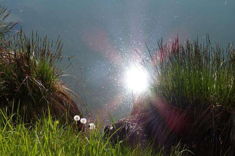 Keywords: sun reflection water bank grass