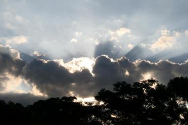 Keywords: sun shining dark clouds light rays light edge light shafts silver edging trees sky