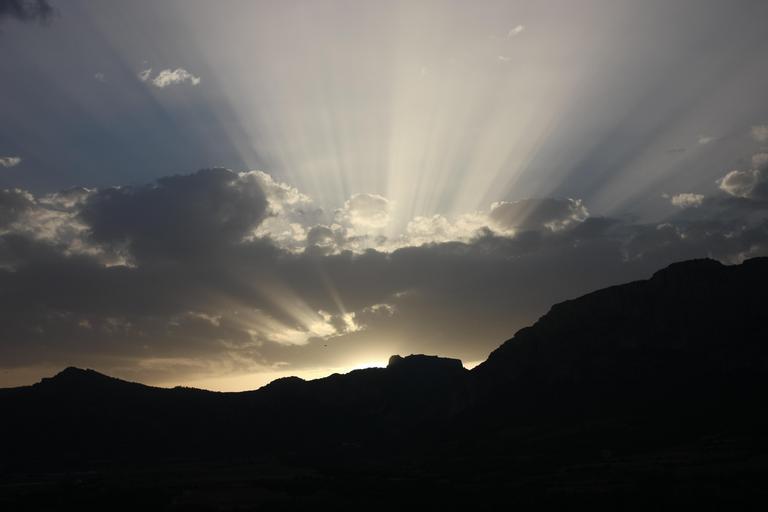 Keywords: sunbeams light sky sunlight streams mountain