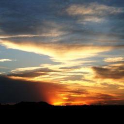Keywords: sundown cloud streaky flocky orange and yellow white and shadow blue sky sun orb sinking horizon dark
