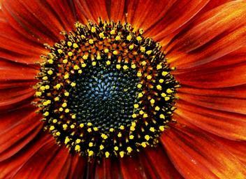 Keywords: sunflower red orange pollen yellow specks black-brown seeds petals concentric sun bright round summer