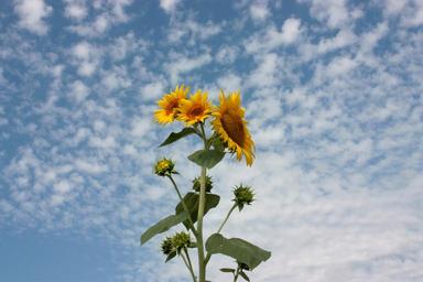 Keywords: sunflower sky clouds nature flower blue yellow floral sunny bright color outdoor summer blue sky rustic