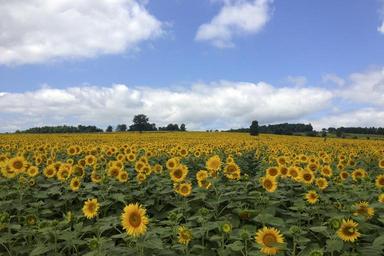 | Keywords: sunflowers field flowers blossoms blooms blooming plants floral yellow petal greenery leaves leafy lands blue sky white fluffy clouds scenic scenery farming farms plantations vegetation decorative ornamental medaows growing growth cheerful bright countrysiderural landscapes tropical |