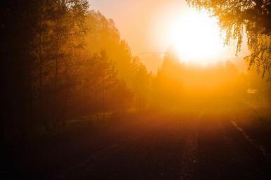 Keywords: sunlight orange dawn dusk sunshine shining shiny golden yellow rays landscape trees road paths sunrise sunset bright colorful evening morning glowing sun star glows scenic scenery outdoors sky nature plants woods silhouette