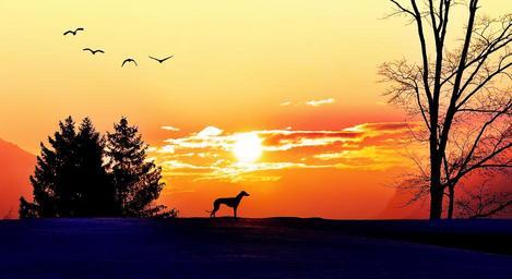 Keywords: sunrise morgenstimmung sunlight lighting sun trees dog birds landscape winter skies nature rest