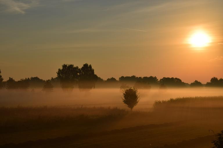 Keywords: sunrise morning mist haze sun fog trees landscape nature mood quiet start of day morning day new day beginning red morgenrot romantic morgenstimmung mysthisch rural