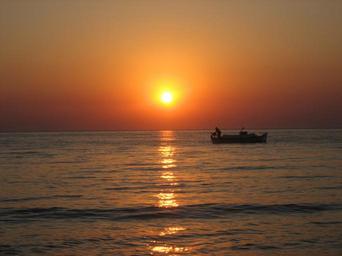 Keywords: sunrise santorini sea fischer island romantic boats greece orange sky evening fish boat