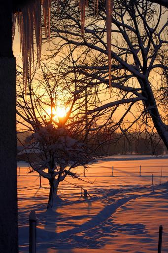 Keywords: sunrise snow icicle winter trees sun light red romantic cold blue morning morgenrot ice fence wintry meadow hoarfrost forest white snowfall old new zealand