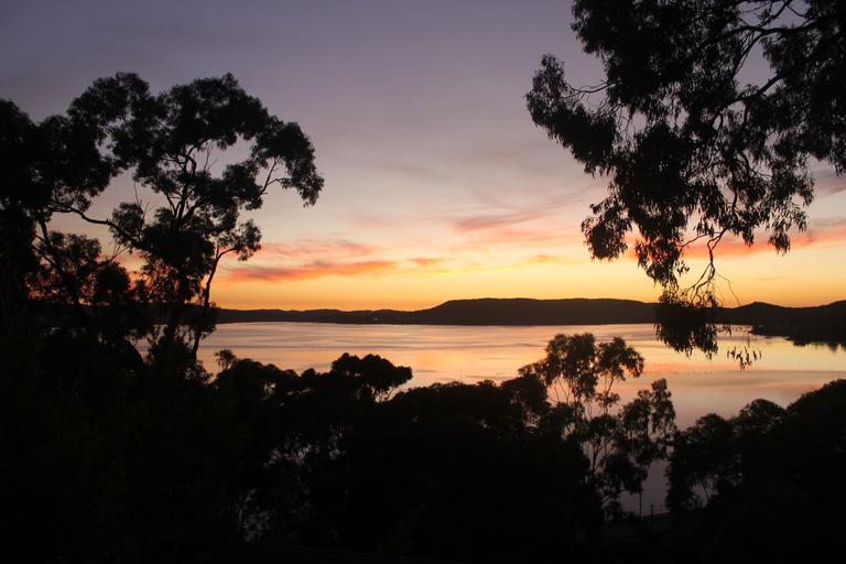 Keywords: sunrise water trees landscape sky nature orange yellow morning coastline silhouette sea