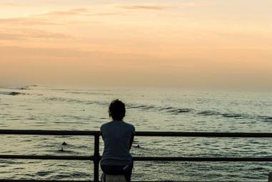 Keywords: sunrise woman watching sea sky people beach