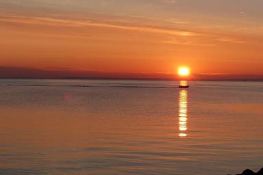 Keywords: sunset back light orange boot mirroring sun evening sky sea afterglow water cloud denmark laesoe coast mood romantic