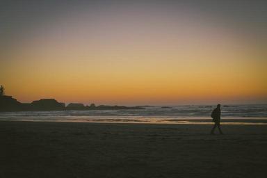 Keywords: sunset beach sand shore waves ocean sea guy man walking people