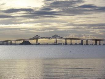 Keywords: sunset bridge water river sky clouds tranquil reflection