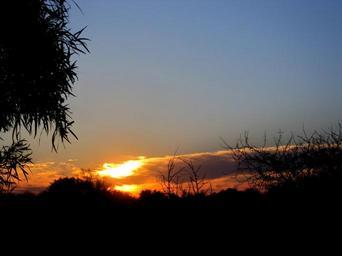 Keywords: sunset bright orange white light yellow purpel clouds linear horizon parallel tree bush sky dusky