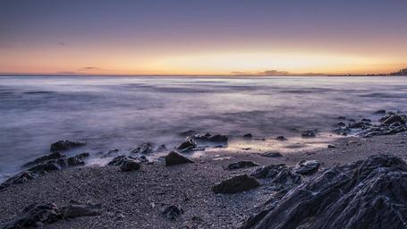 Keywords: sunset calahonda mijas malaga costa del sol andalusia spain sun blue clouds sky beach sea horizon landscape stillness rocks peaceful marina waves