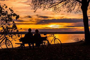 Keywords: sunset couple lake constance abendstimmung more bicycle tour water lake sun sky romantic mood germany clouds orange landscape mirroring tree forest golden autumn pair human bike rest bank park view enjoy tour together community