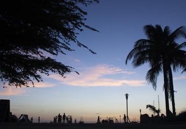 Keywords: sunset dusk silhouette palm trees harbor harbour people sky clouds lamp post