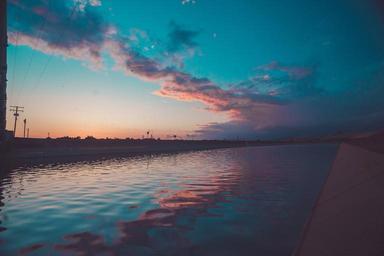 Keywords: sunset dusk sky clouds water reflection landscape nature power lines blue