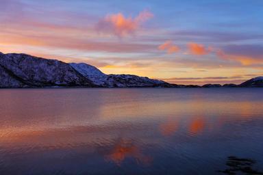 Keywords: sunset ever-changing orange red blue reflection amazing beautiful sea fjord snow mountain winter travel lauklines kystferie kvaloya kvaløysletta norway tromso scandinavia europe