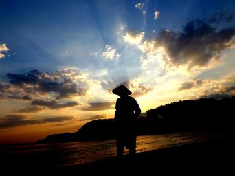 Keywords: sunset fisherman water reflection sun twilight in the evening shadow red sky