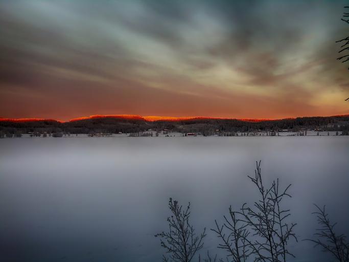 Keywords: sunset forest trees woods landscape scenic snow winter vista sunlight sky clouds nature outside countryside sweden hdr