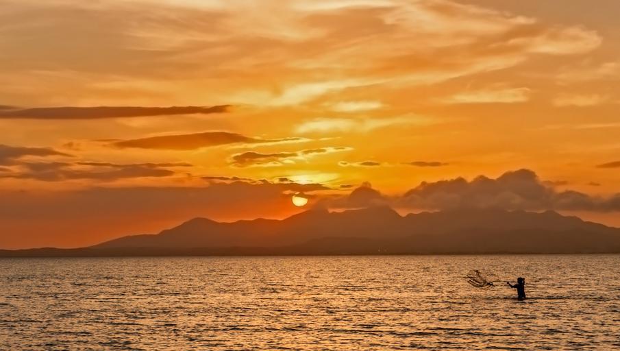 Keywords: sunset lagoon fishing sea water mountains landscape child island coast seascape