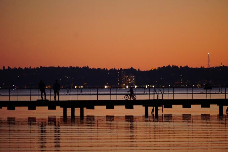 Keywords: sunset lake bridge silhouettes pedestrians landscape lake washington seattle washington usa evening dusk twilight reflection sky colorful outdoors urban orange shore lights scenic calm