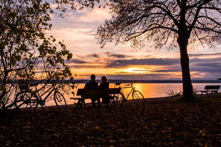 Keywords: sunset lake constance water lake sun sky romantic mood germany clouds orange landscape mirroring abendstimmung tree forest golden autumn couple pair human bike rest bank park view enjoy more bicycle tour tour together community