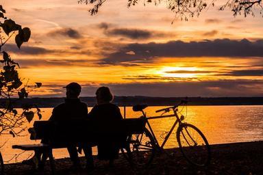 Keywords: sunset lake constance water lake sun sky romantic mood germany clouds orange landscape mirroring abendstimmung tree forest golden autumn couple pair human bike rest bank park view enjoy more bicycle tour tour together community