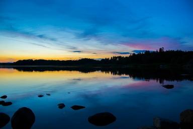 Keywords: sunset lake reflection water sky landscape nature evening sun blue calm summer outdoors silhouette horizon colorful peaceful