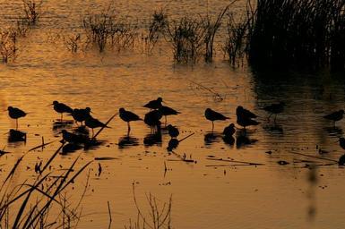 Keywords: sunset landscape twilight dusk birds silhouettes sunshine colorful scenic lake marsh view outdoors water shore birds waders