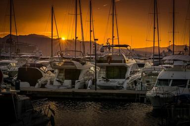 Keywords: sunset marina boats dusk twilight hills landscape seascape sky colorful dock luxury ships close up port sea ocean shadows evening sun setting harbor pier