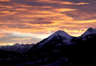 Keywords: sunset mountains afterglow evening sky abendstimmung bernese oberland sun sky clouds evening color orange pink purple violet beautiful unique gradient natural spectacle
