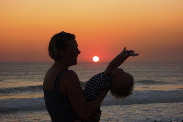 Keywords: sunset mum mother child love hub surf beach indonesia summer family female caucasian woman mom parent young kid coast son