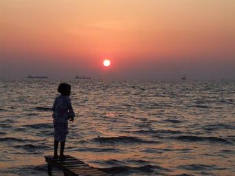 Keywords: sunset ocean sea water sun sky orange child watching pier silhouette horizon ships seascape scenic potenga bangledesh