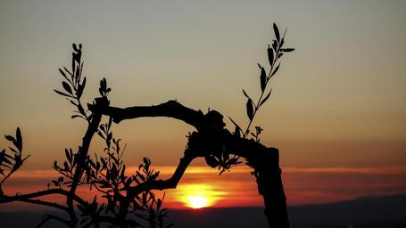 Keywords: sunset olive tree branches nature olive branch landscape sun back light sky gloomy mood setting mystical silhouette orange
