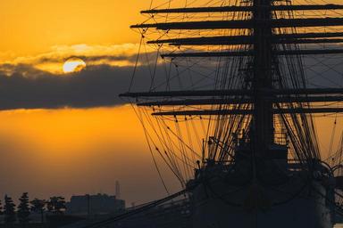 Keywords: sunset sailing ship superstructure masts vessel silhouette clouds sky dusk twilight sea boat sailboat nautical marine