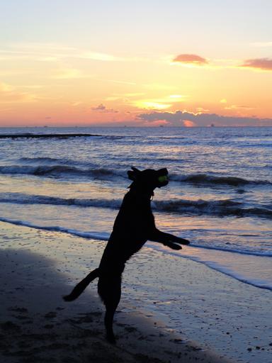 Keywords: sunset sea dog ball game jump labrador play fun animal world holland beach walk abendstimmung sun joy