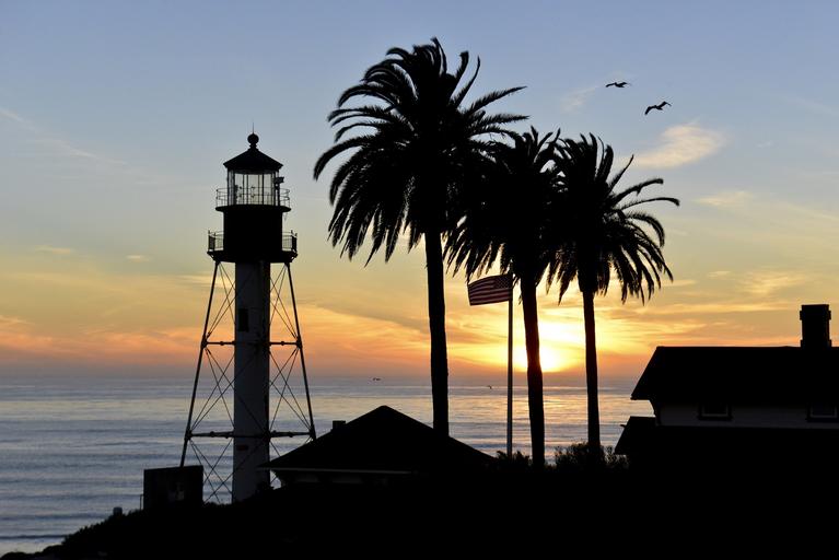 Keywords: sunset seascape water lighthouse silhouettes san diego california usa american flag flag pole horizon sun dusk evening landscape coast shore coastline scenic sky ocean birds