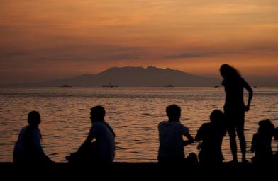 Keywords: sunset seascape water sky people watching enjoying scenic silhouettes sitting standing mountain hill waves ocean sea landscape