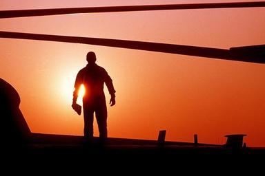 Keywords: sunset silhouette helicopter crew sky outdoor dusk evening person man male sunlight
