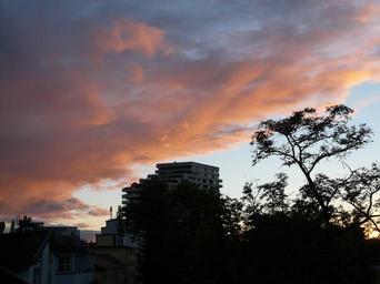 Keywords: sunset sky clouds afterglow city homes tree