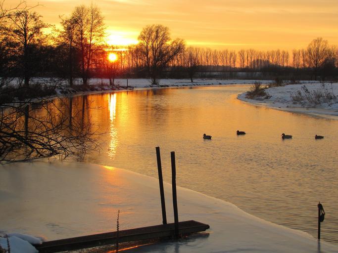 Keywords: sunset snow landscape ducks river