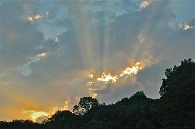Keywords: sunset sun clouds outdoor rays streaks greenery canopy dusk
