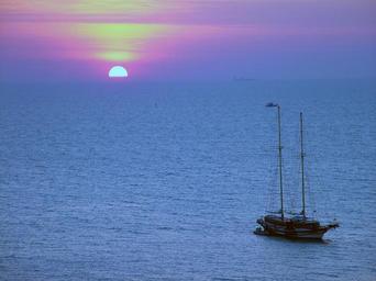 Keywords: sunset sun falls sea blue beautiful horizon in the evening ship